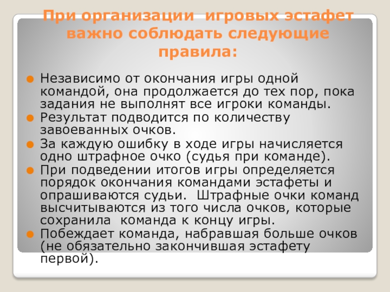 Слайд 11При организации игровых эстафет важно соблюдать следующие правила: