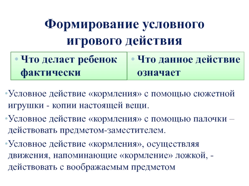 Условное действие «кормления», осуществляя движения, напоминающие «кормление» ложкой, - действовать с воображаемым предметом