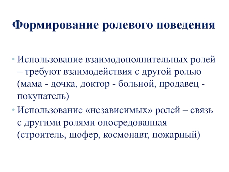 «независимых» ролей – связь с другими ролями опосредованная (строитель, шофер, космонавт, пожарный)