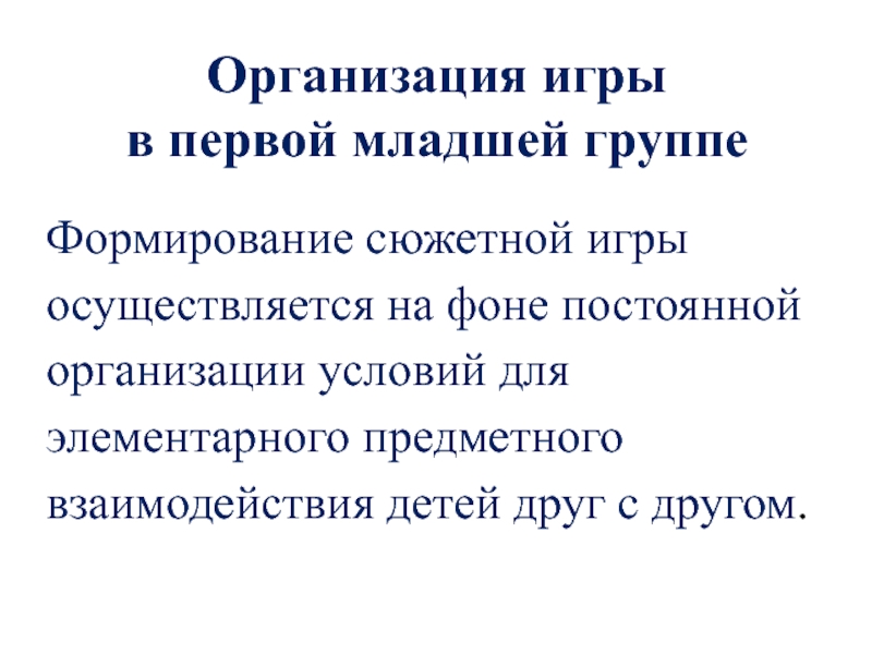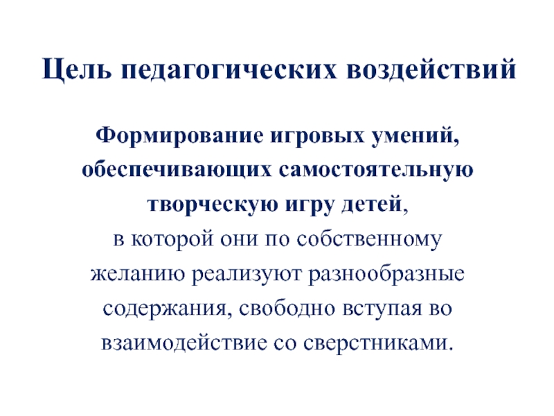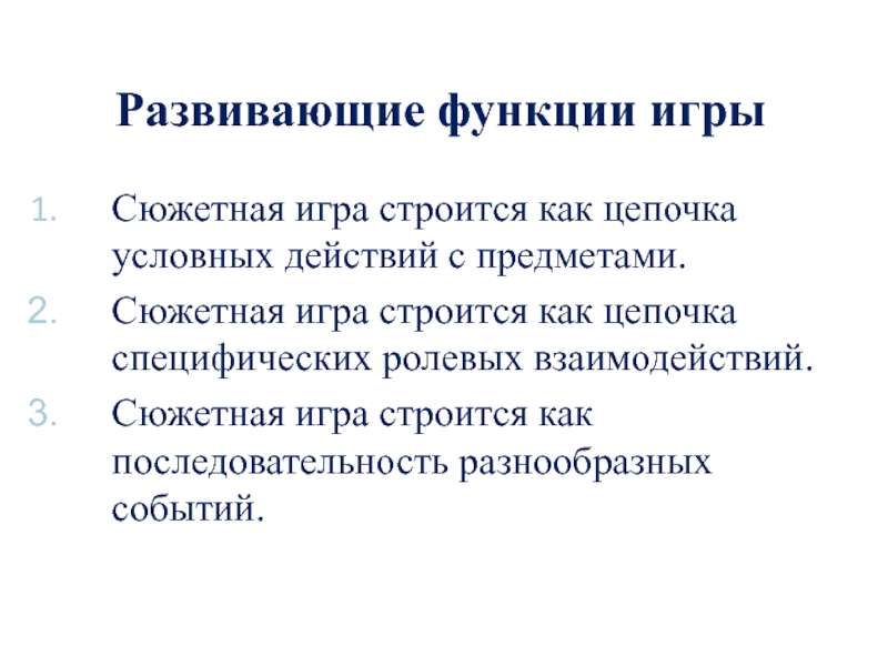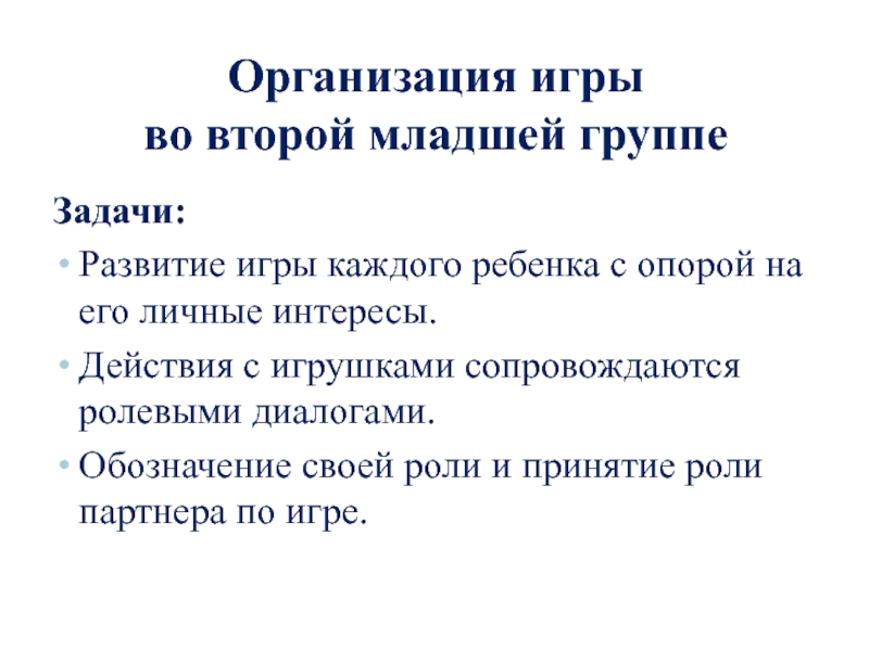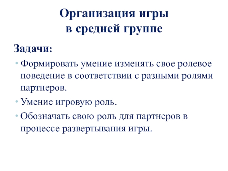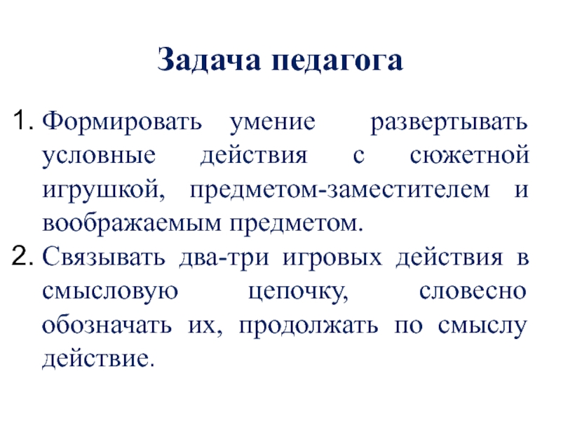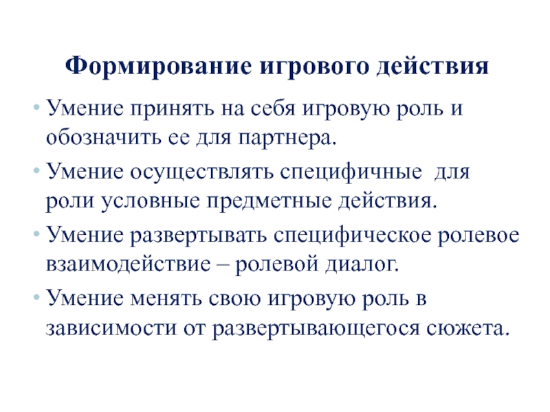 На каждом этапе дошкольного детства формировать игровые умения, ориентируя ребенка на осуществление игрового действия и пояснение его смысла партнеру по игре.