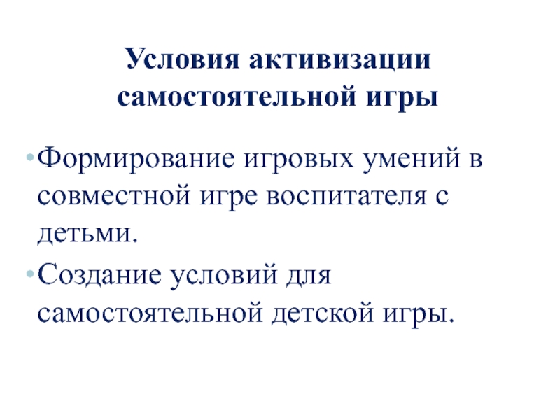 ситуации формирования игровых умений в совместной игре взрослого с детьми, где взрослый – «играющий партнер», и самостоятельной детской игры, в которую взрослый непосредственно не включается, а лишь обеспечивает условия для нее.