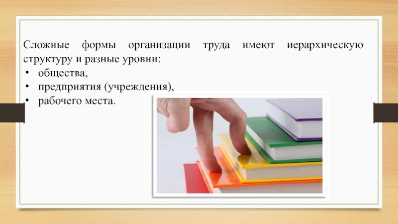 Слайд 5Сложные формы организации труда имеют иерархическую структуру и разные уровни: