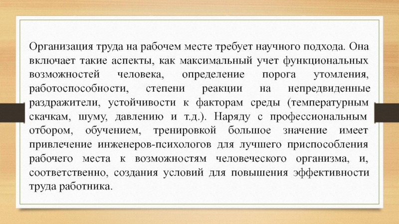 Слайд 8Организация труда на рабочем месте требует научного подхода. Она включает