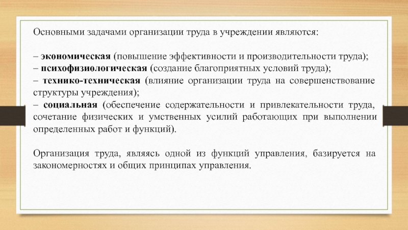 Слайд 13Основными задачами организации труда в учреждении являются:
