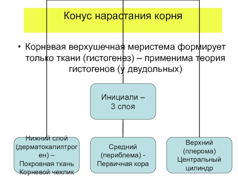 Корневая верхушечная меристема формирует только ткани (гистогенез) –