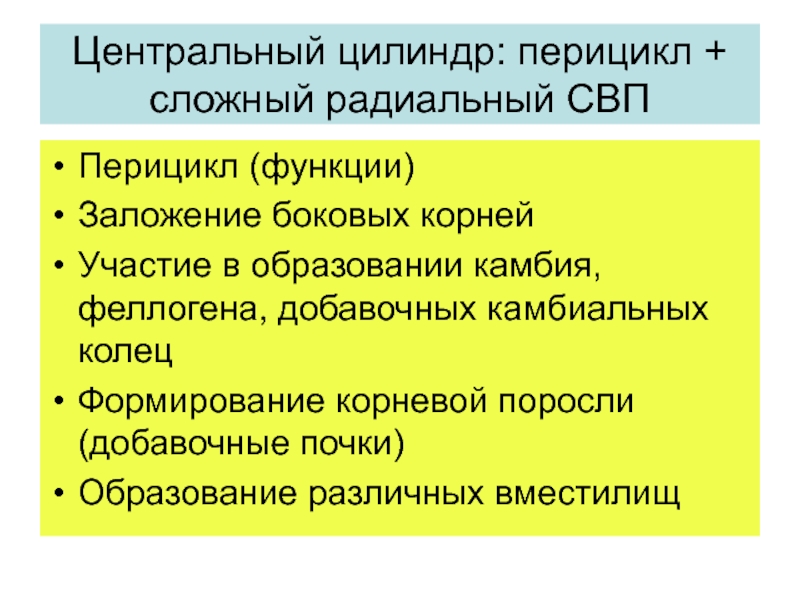 Слайд 15Центральный цилиндр: перицикл + сложный радиальный СВП