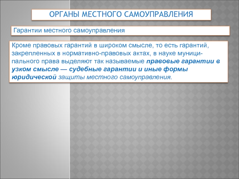 узком смысле — судебные гарантии и иные формы юридической защиты местного самоуправления.