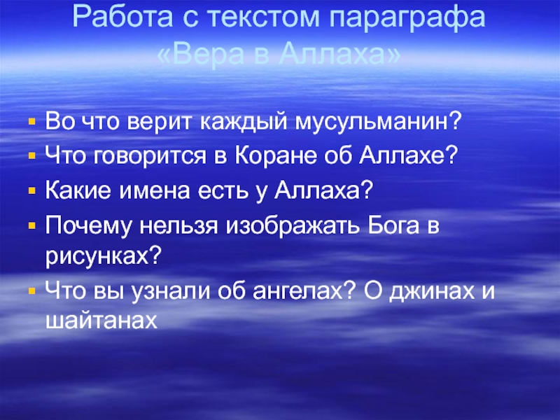 Слайд 12Работа с текстом параграфа «Вера в Аллаха»