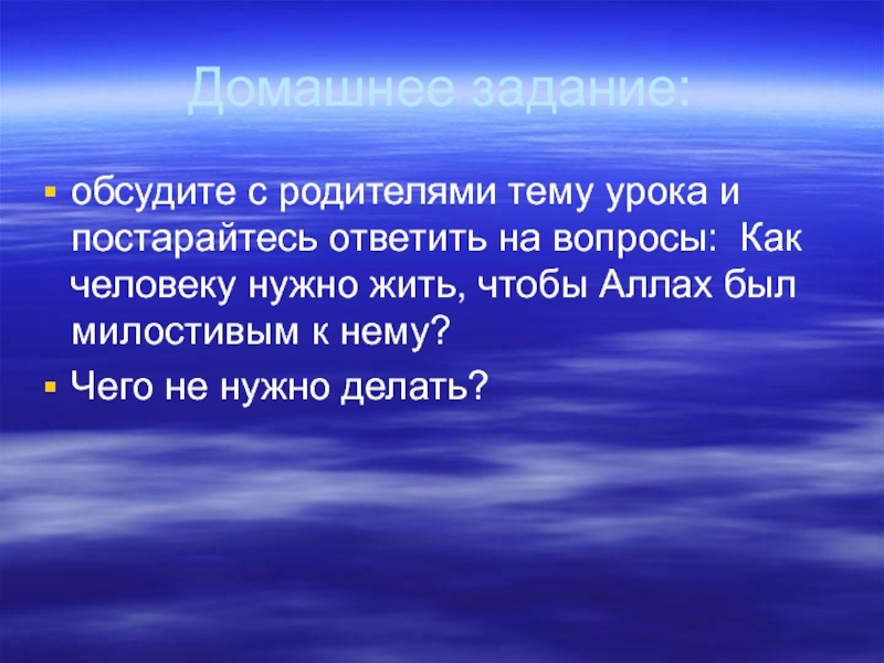 Домашнее задание:обсудите с родителями тему урока и постарайтесь ответить на вопросы: Как человеку нужно жить, чтобы Аллах