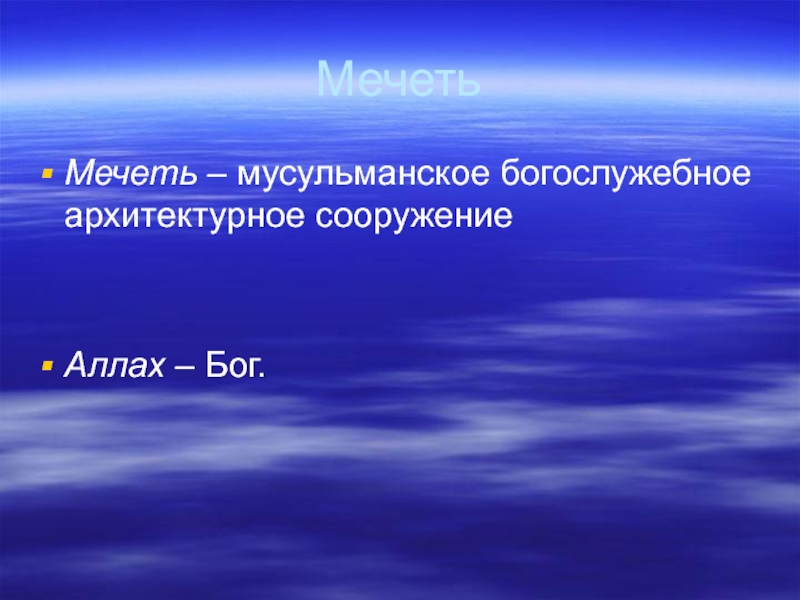 МечетьМечеть – мусульманское богослужебное архитектурное сооружениеАллах – Бог.