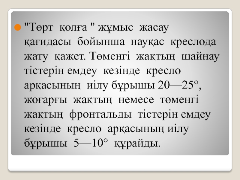 Слайд 20"Төрт қолға " жұмыс жасау қағидасы бойынша науқас креслода жату