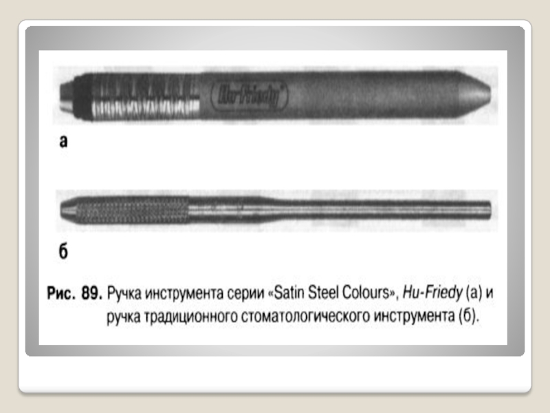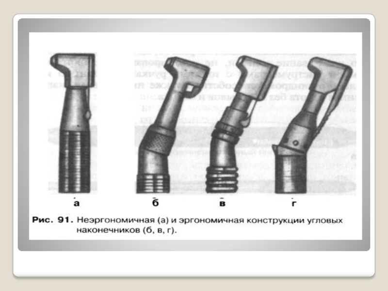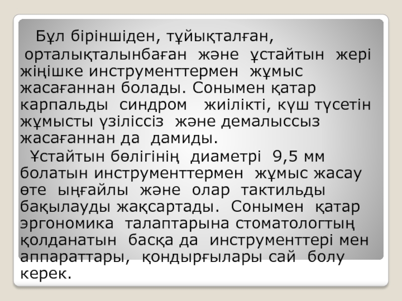 Ұстайтын бөлігінің диаметрі 9,5 мм болатын инструменттермен жұмыс жасау өте ыңғайлы және олар тактильды бақылауды жақсартады. Сонымен қатар эргономика талаптарына стоматологтың қолданатын басқа да инструменттері мен аппараттары, қондырғылары сай болу керек.