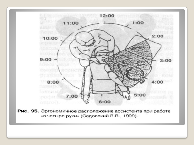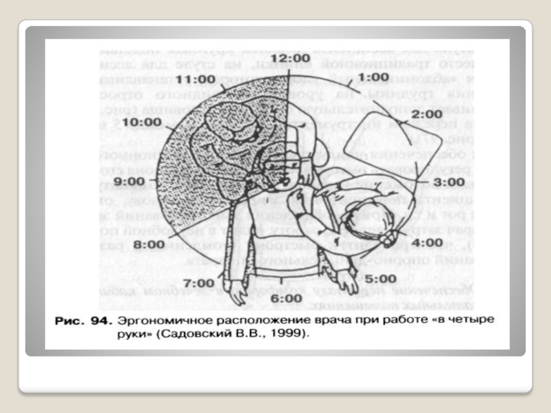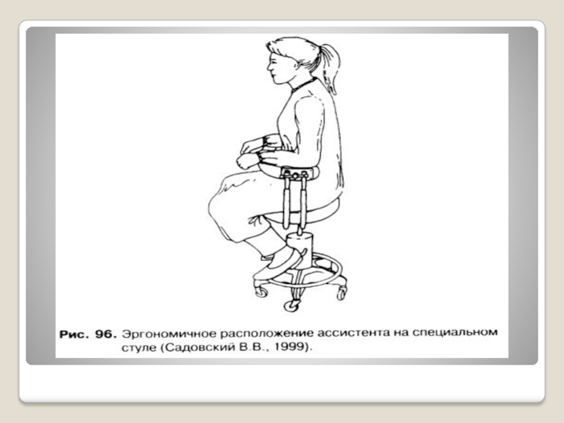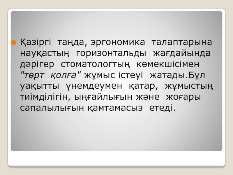 Слайд 17Қазіргі таңда, эргономика талаптарына науқастың горизонтальды жағдайында дәрігер стоматологтың көмекшісімен