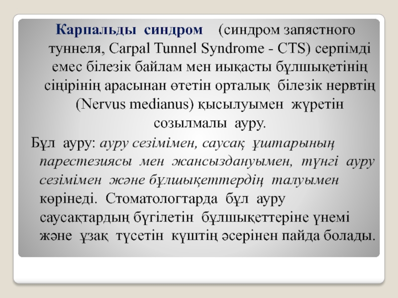 Слайд 10Карпальды синдром (синдром запястного туннеля, Carpal Tunnel Syndrome -