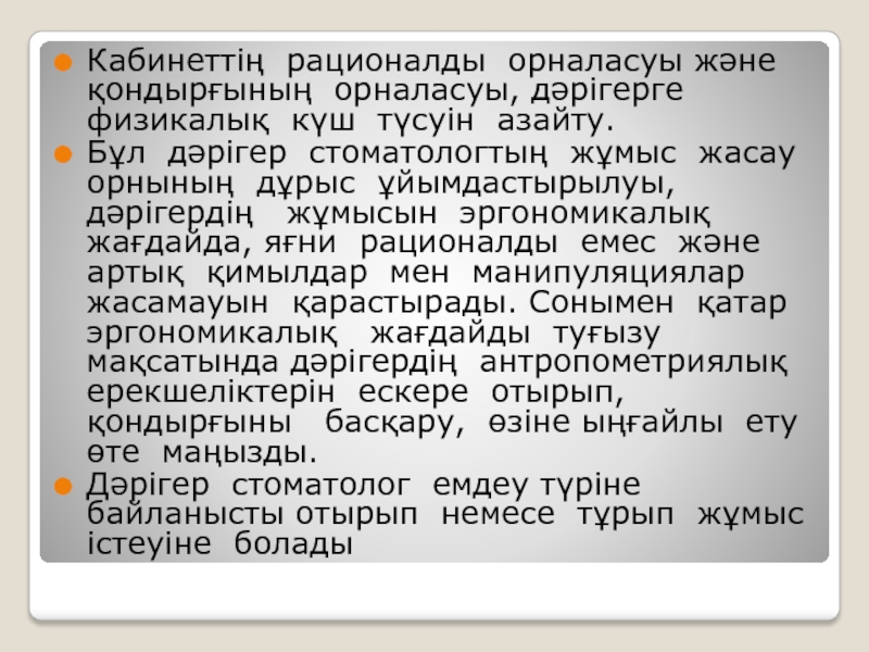 Бұл дәрігер стоматологтың жұмыс жасау орнының дұрыс ұйымдастырылуы, дәрігердің