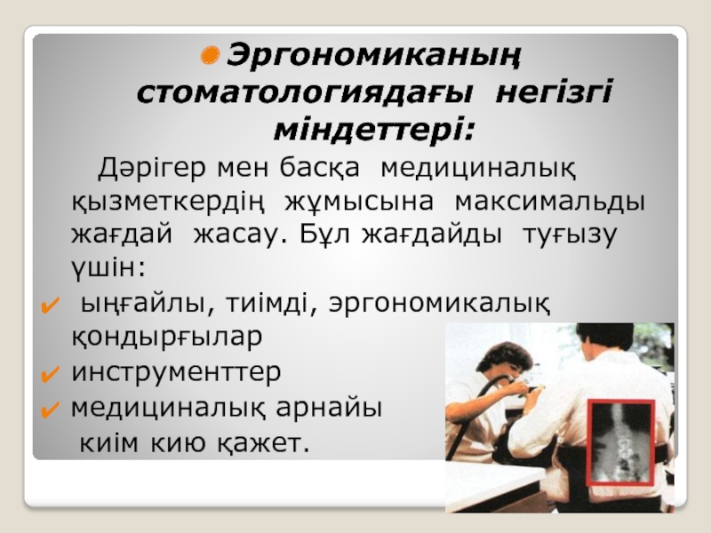 Слайд 5Эргономиканың стоматологиядағы негізгі міндеттері: