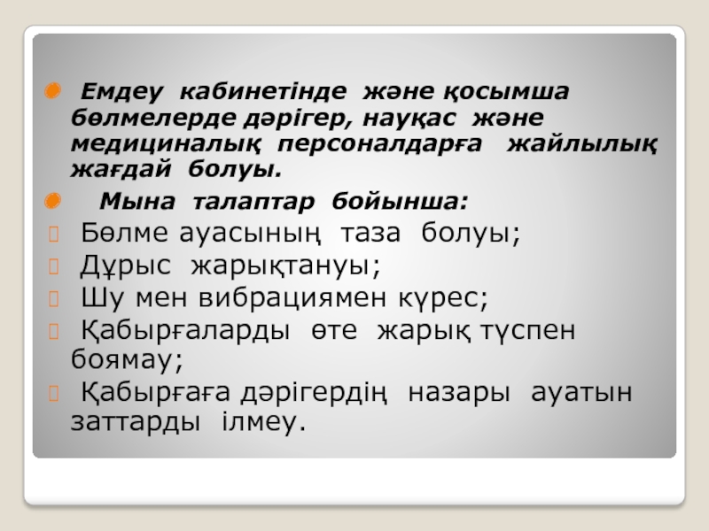 Емдеу кабинетінде және қосымша бөлмелерде дәрігер, науқас және медициналық персоналдарға