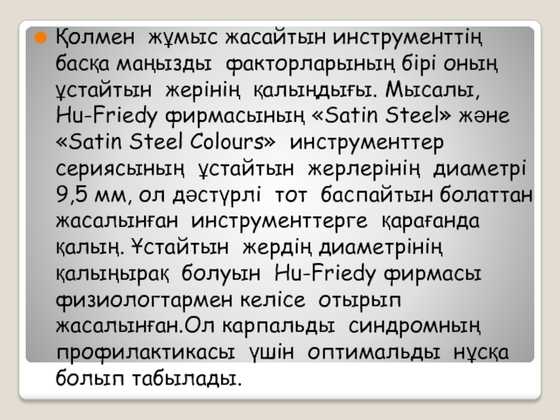 жерінің қалыңдығы. Мысалы, Hu-Friedy фирмасының «Satin Steel» және «Satin Steel