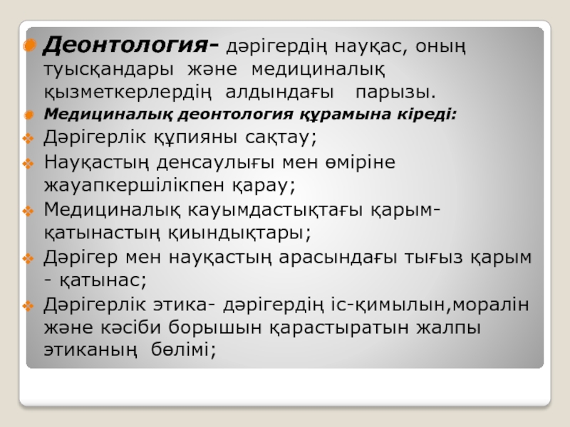Слайд 3Деонтология- дәрігердің науқас, оның туысқандары және медициналық қызметкерлердің алдындағы