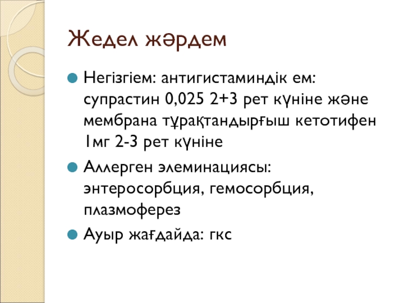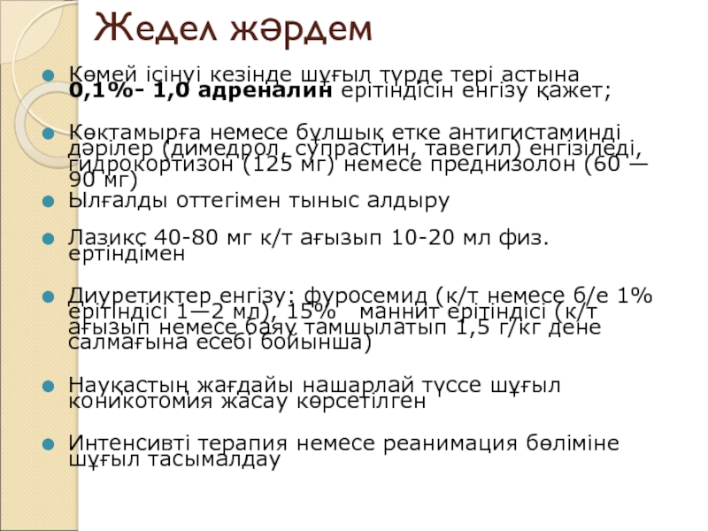 Жедел аллергиялық реакциялар. Дәрілік, тағамдық, жәндіктер аллергиясы. Балалардағы вакцинадан кейінгі аллергиялық реакциялар. Есекжем. Ангионевротикалық ісік (Квинке ісінуі). Диагностикасы. Шұғыл көмек.