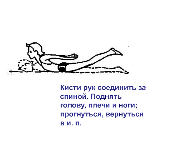 Слайд 9Кисти рук соединить за спиной. Поднять голову, плечи и ноги;