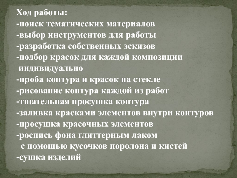 - изучение возможностей палитры красок для росписи стекла.