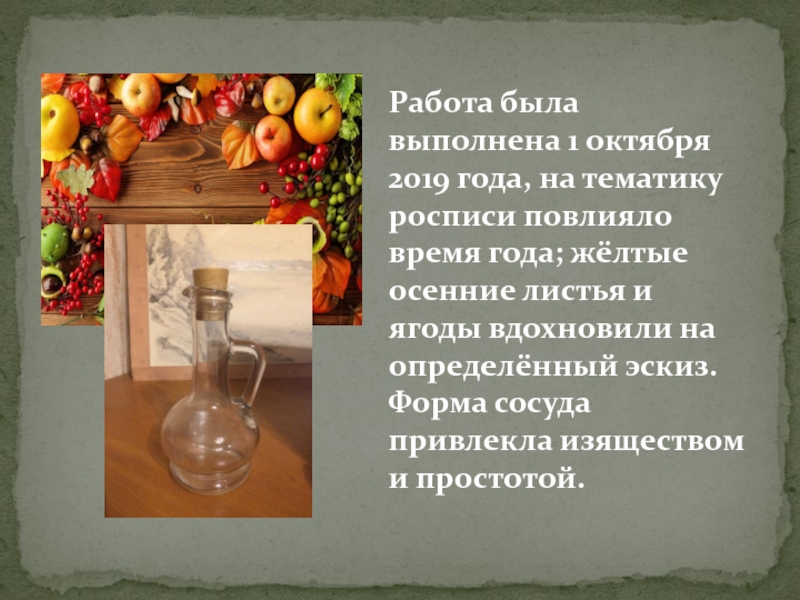 Слайд 4Работа была выполнена 1 октября 2019 года, на тематику росписи