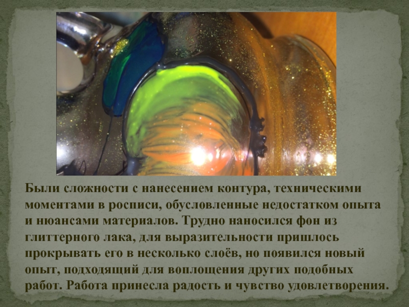 Слайд 9Были сложности с нанесением контура, техническими моментами в росписи, обусловленные