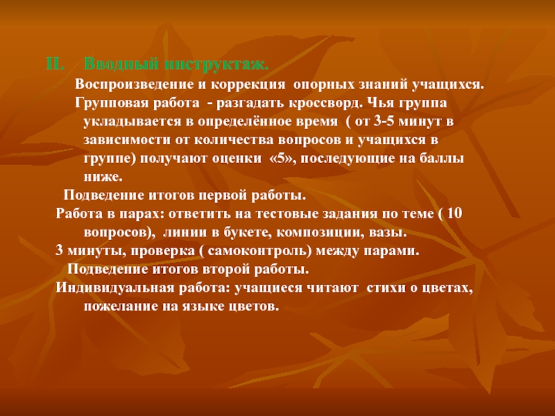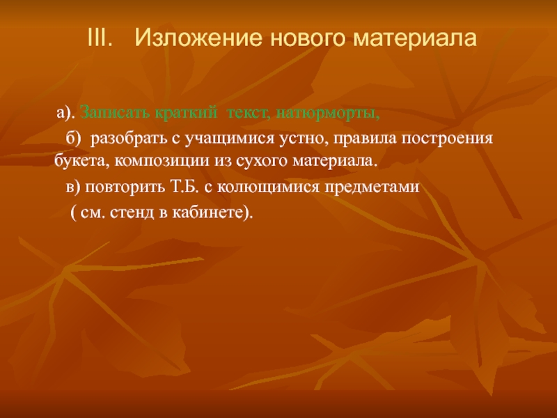 разобрать с учащимися устно, правила построения букета, композиции из сухого материала.