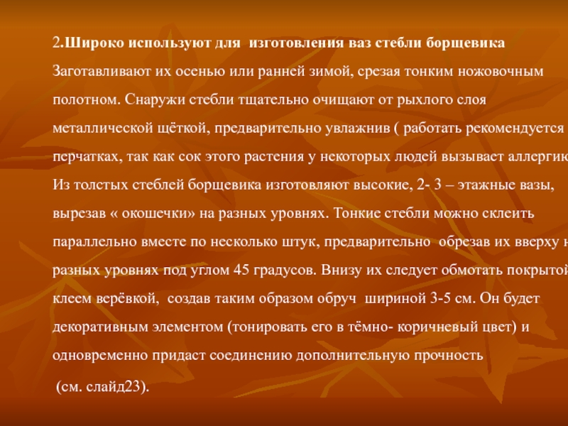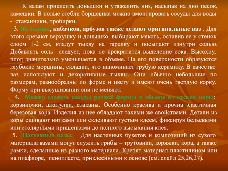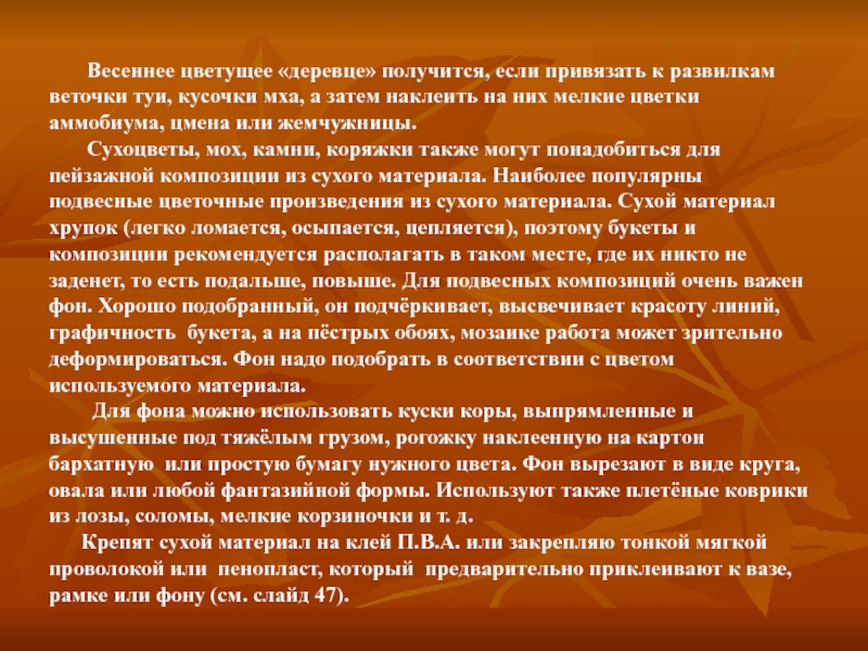 Крепят сухой материал на клей П.В.А. или закрепляю тонкой мягкой проволокой или пенопласт, который предварительно приклеивают к вазе, рамке или фону (см. слайд 47).