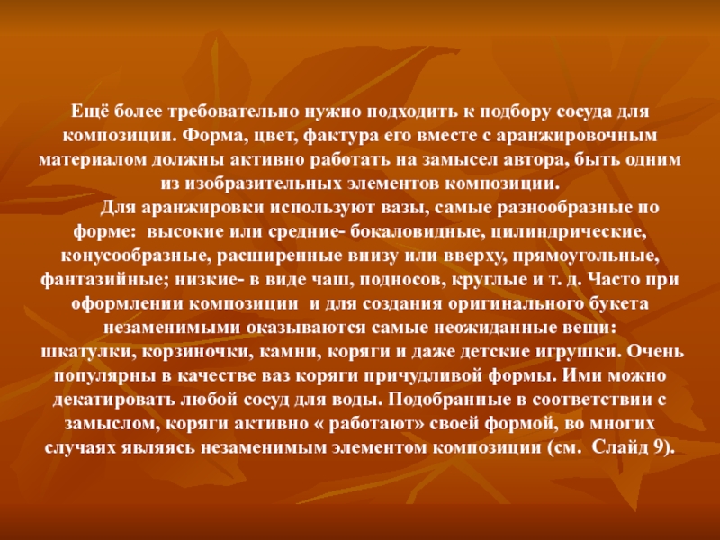 для композиции. Форма, цвет, фактура его вместе с аранжировочным материалом должны активно работать на замысел автора, быть одним из изобразительных элементов композиции.