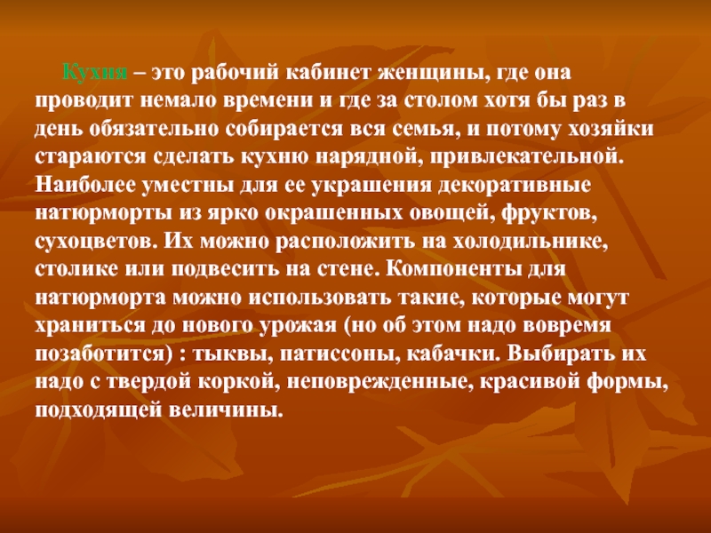 раз в день обязательно собирается вся семья, и потому хозяйки стараются сделать кухню нарядной, привлекательной. Наиболее уместны для ее украшения декоративные натюрморты из ярко окрашенных овощей, фруктов, сухоцветов. Их можно расположить на холодильнике, столике или подвесить на стене. Компоненты для натюрморта можно использовать такие, которые могут храниться до нового урожая (но об этом надо вовремя позаботится) : тыквы, патиссоны, кабачки. Выбирать их надо с твердой коркой, неповрежденные, красивой формы, подходящей величины.