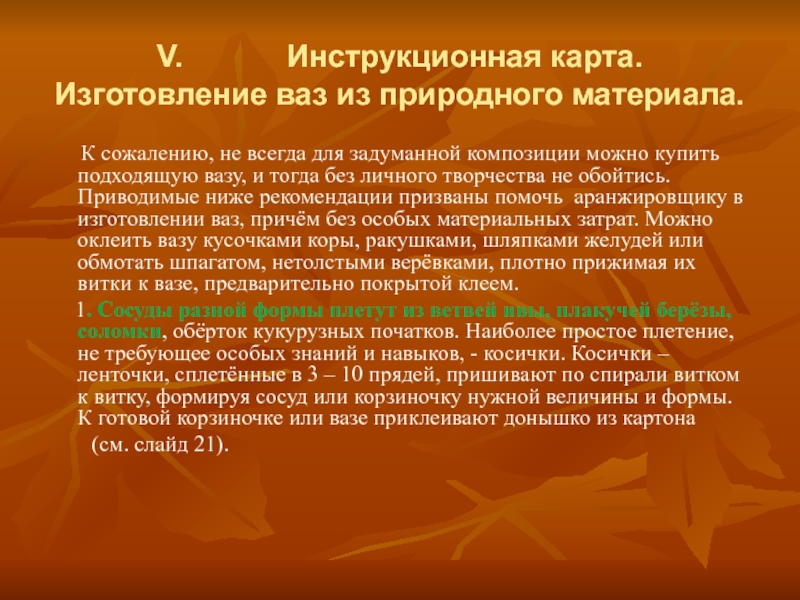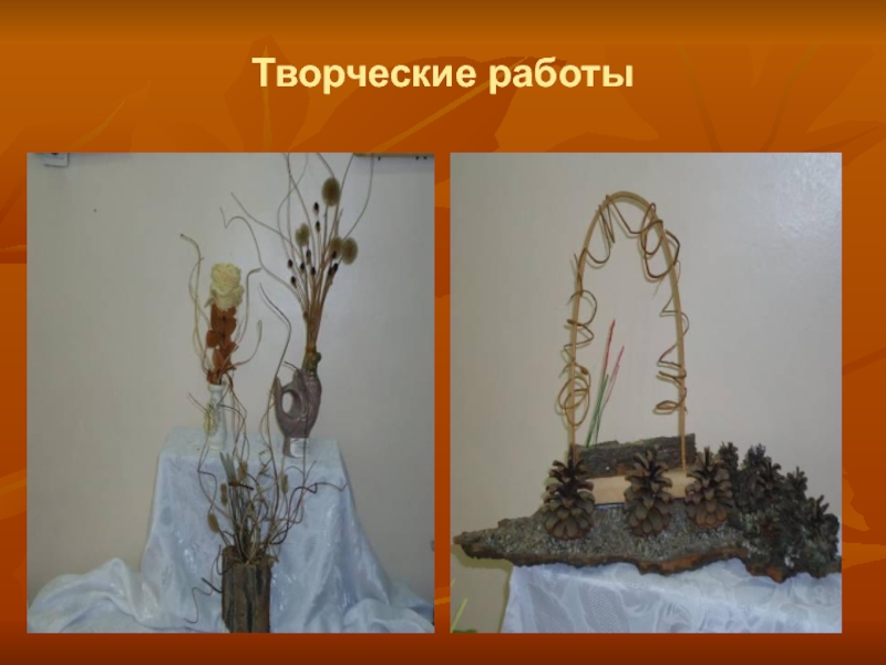 Данные уроки – презентации расчитаны на 6 -8 учебных часов (на усмотрение учителя) , 10% предусматривает изучение теоретической части, остальное время посвящается практической работе с природным материалом. В презентации показаны творческие работы учащихся (фотографии).