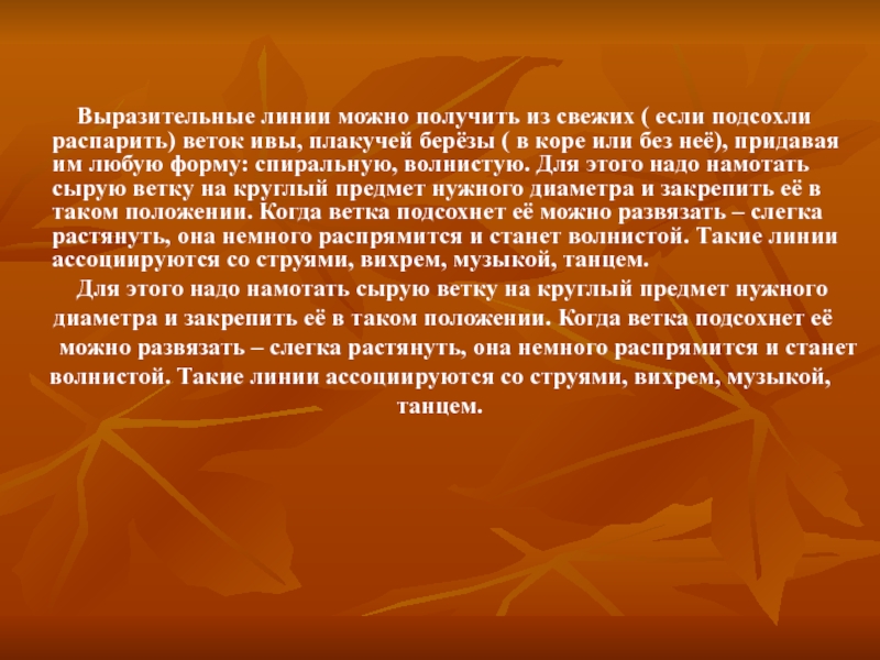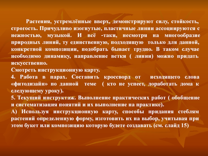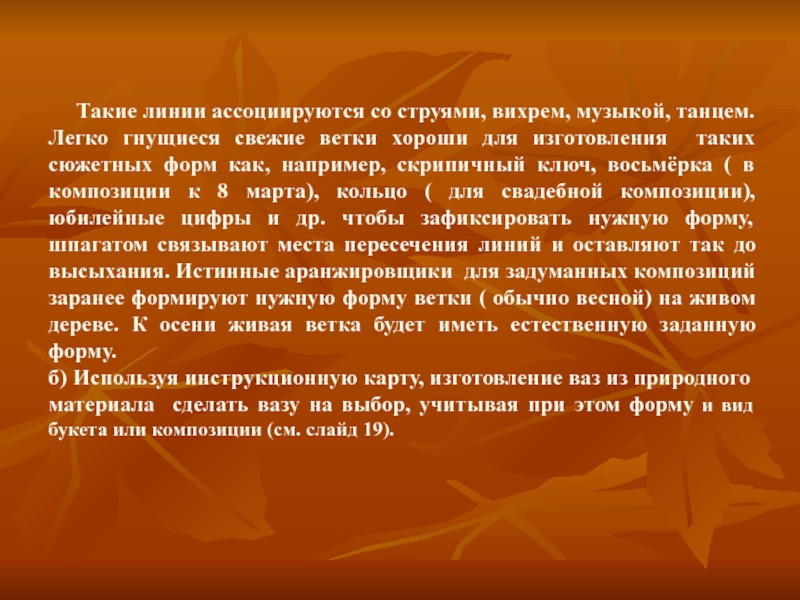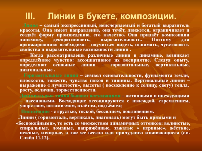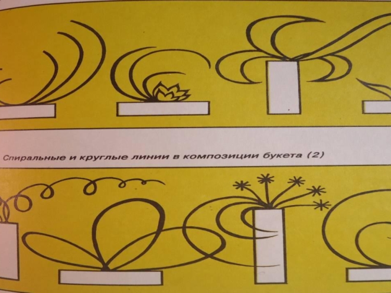 направление, она течёт, движется, ограничивает и создаёт форму произведению, его качество. Она придаёт композиции динамику, декоративность, выразительность. Поэтому для аранжировщика необходимо научиться видеть, понимать, чувствовать свойства и выразительные возможности линии .