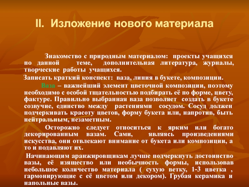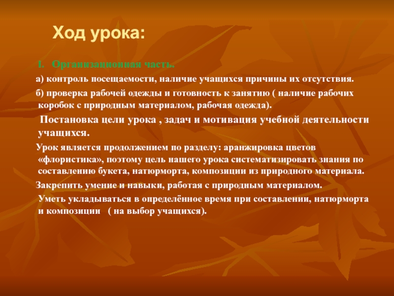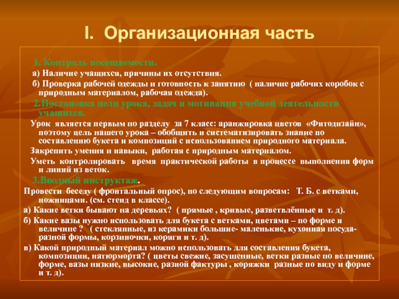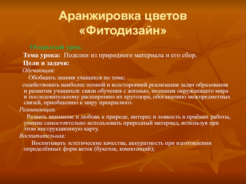 Урок является первым по разделу за 7 класс: аранжировка цветов «Фитодизайн», поэтому цель нашего урока – обобщить и систематизировать знание по составлению букета и композиций с использованием природного материала.