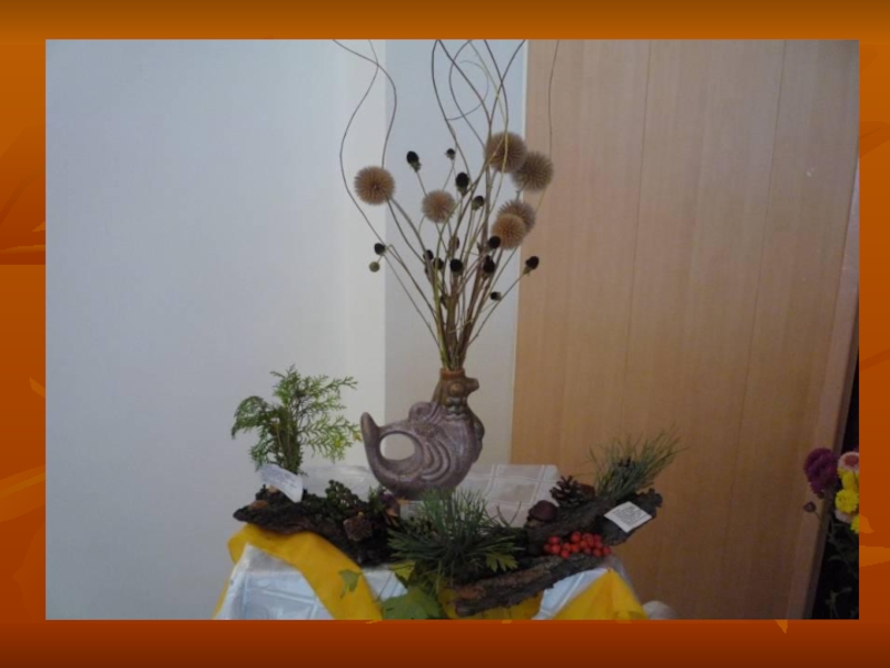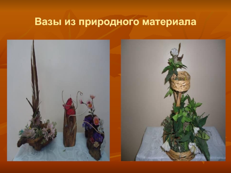 шкатулки, корзиночки, камни, коряги и даже детские игрушки. Очень популярны в качестве ваз коряги причудливой формы. Ими можно декатировать любой сосуд для воды. Подобранные в соответствии с замыслом, коряги активно « работают» своей формой, во многих случаях являясь незаменимым элементом композиции (см. Слайд 9).