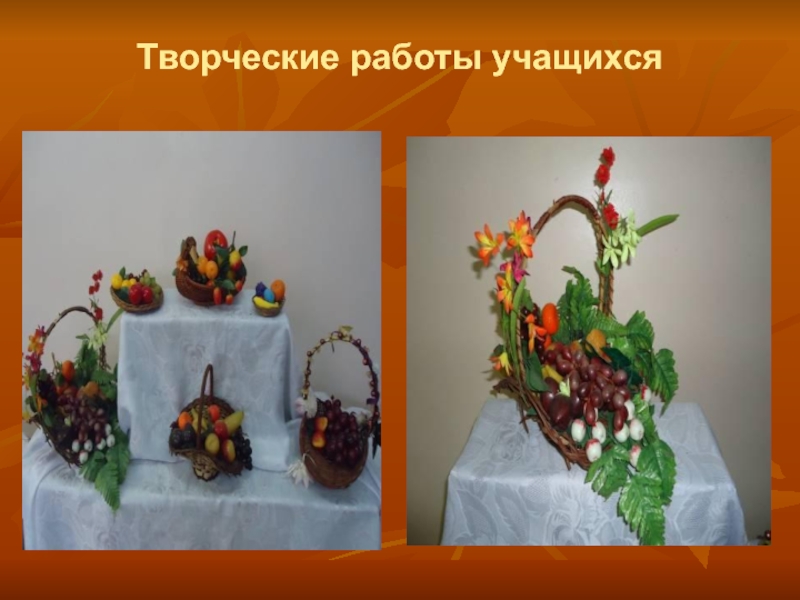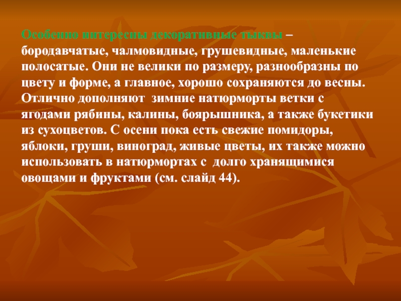 а главное, хорошо сохраняются до весны. Отлично дополняют зимние натюрморты ветки с ягодами рябины, калины, боярышника, а также букетики из сухоцветов. С осени пока есть свежие помидоры, яблоки, груши, виноград, живые цветы, их также можно использовать в натюрмортах с долго хранящимися овощами и фруктами (см. слайд 44).