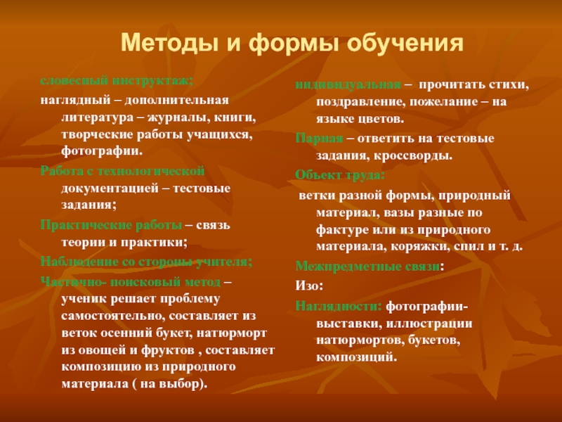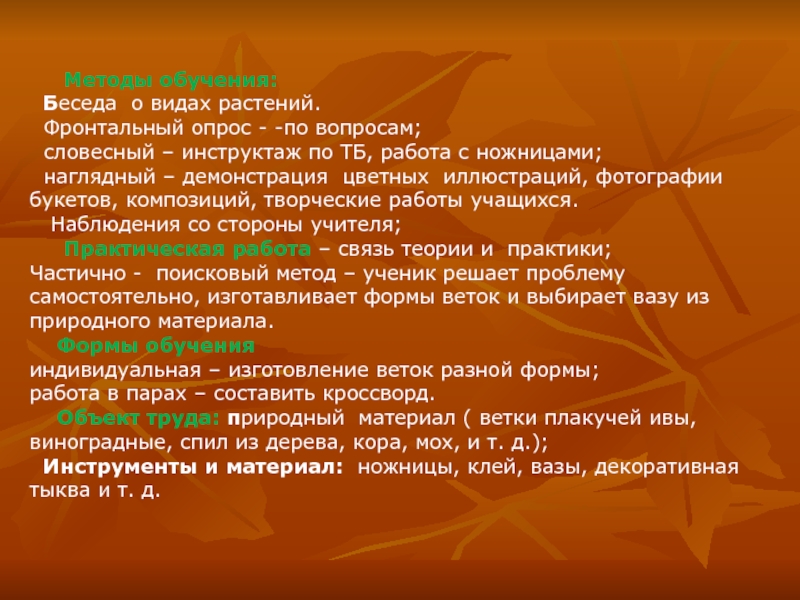Частично - поисковый метод – ученик решает проблему самостоятельно, изготавливает формы веток и выбирает вазу из природного материала.
