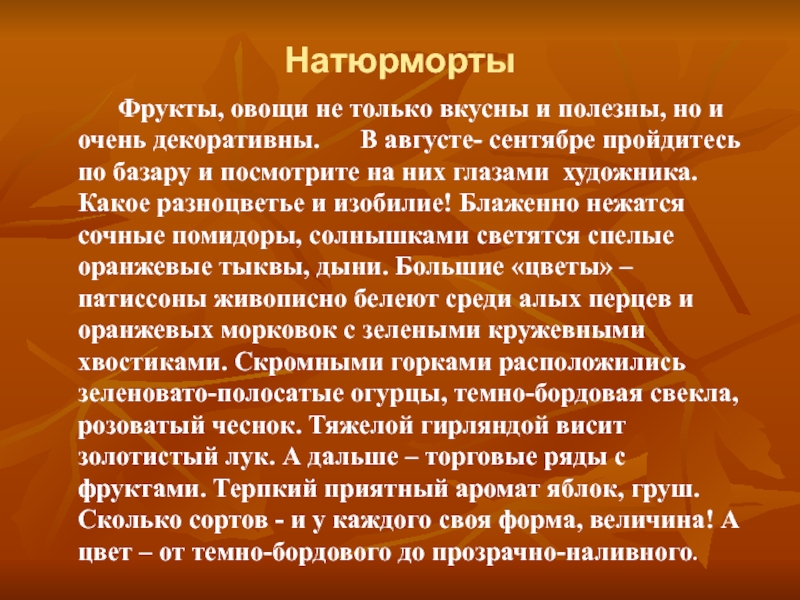 В августе- сентябре пройдитесь по базару и посмотрите на них глазами художника. Какое разноцветье и изобилие! Блаженно нежатся сочные помидоры, солнышками светятся спелые оранжевые тыквы, дыни. Большие «цветы» – патиссоны живописно белеют среди алых перцев и оранжевых морковок с зелеными кружевными хвостиками. Скромными горками расположились зеленовато-полосатые огурцы, темно-бордовая свекла, розоватый чеснок. Тяжелой гирляндой висит золотистый лук. А дальше – торговые ряды с фруктами. Терпкий приятный аромат яблок, груш. Сколько сортов - и у каждого своя форма, величина! А цвет – от темно-бордового до прозрачно-наливного.