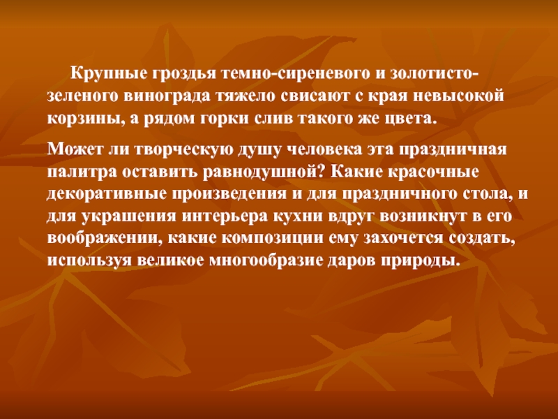 Может ли творческую душу человека эта праздничная палитра оставить равнодушной? Какие красочные декоративные произведения и для праздничного стола, и для украшения интерьера кухни вдруг возникнут в его воображении, какие композиции ему захочется создать, используя великое многообразие даров природы.