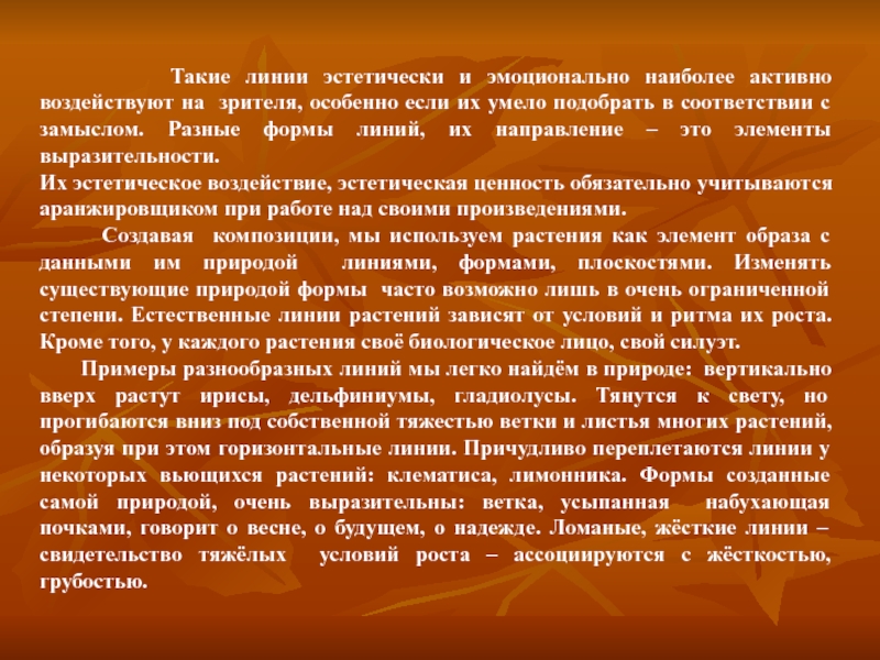 Примеры разнообразных линий мы легко найдём в природе: вертикально вверх растут ирисы, дельфиниумы, гладиолусы. Тянутся к свету, но прогибаются вниз под собственной тяжестью ветки и листья многих растений, образуя при этом горизонтальные линии. Причудливо переплетаются линии у некоторых вьющихся растений: клематиса, лимонника. Формы созданные самой природой, очень выразительны: ветка, усыпанная набухающая почками, говорит о весне, о будущем, о надежде. Ломаные, жёсткие линии – свидетельство тяжёлых условий роста – ассоциируются с жёсткостью, грубостью.