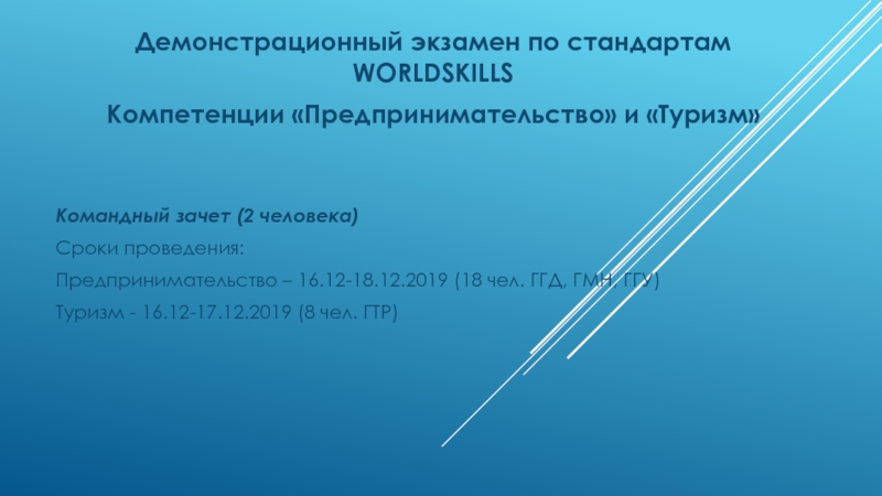 Демонстрационный экзамен по стандартам WORLDSKILLSКомпетенции «Предпринимательство» и «Туризм»Командный зачет (2 человека)Сроки проведения:Предпринимательство – 16.12-18.12.2019 (18 чел. ГГД,