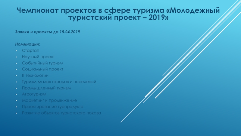 Слайд 3Чемпионат проектов в сфере туризма «Молодежный туристский проект – 2019»