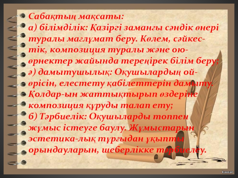 Сабақтың мақсаты: а) білімділік: Қазіргі заманғы сәндік өнері туралы мағлұмат беру. Көлем, сәйкес-тік, композиция туралы және ою-өрнектер жайында
