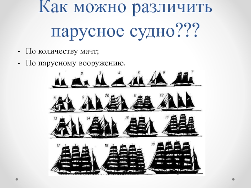 Как можно различить парусное судно???По количеству мачт;По парусному вооружению.
