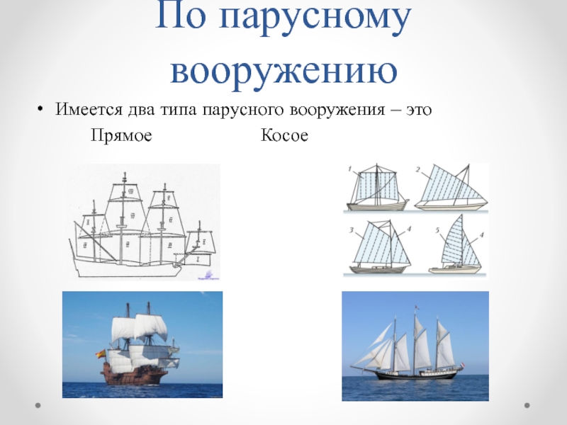 По парусному вооружениюИмеется два типа парусного вооружения – это    	Прямое				Косое