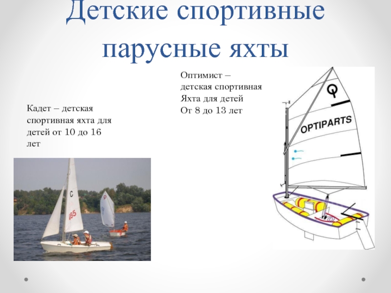 Детские спортивные парусные яхтыКадет – детская спортивная яхта для детей от 10 до 16 летОптимист – детская