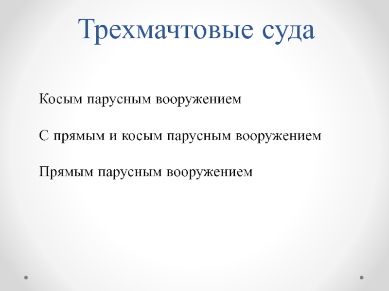 Трехмачтовые судаКосым парусным вооружениемС прямым и косым парусным вооружениемПрямым парусным вооружением