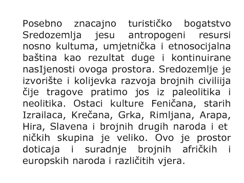 ovoga prostora. Sredozemlje je izvorište i kolijevka razvoja brojnih civiliija čije tragove pratimo jos iz paleolitika i neolitika. Ostaci kulture Feničana, starih Izrailaca, Krečana, Grka, Rimljana, Arapa, Hira, Slavena i brojnih drugih naroda i etničkih skupina je veliko. Ovo je prostor doticaja i suradnje brojnih afričkih i europskih naroda i različitih vjera.