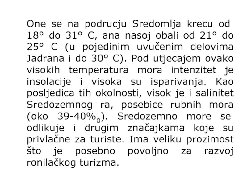 pojedinim uvučenim delovima Jadrana i do 30° C). Pod utjecajem ovako visokih temperatura mora intenzitet je insolacije i visoka su isparivanja. Kao posljedica tih okolnosti, visok je i salinitet Sredozemnog ra, posebice rubnih mora (oko 39-40%0). Sredozemno more se odlikuje i drugim značajkama koje su privlačne za turiste. Ima veliku prozimost što je posebno povoljno za razvoj ronilačkog turizma.